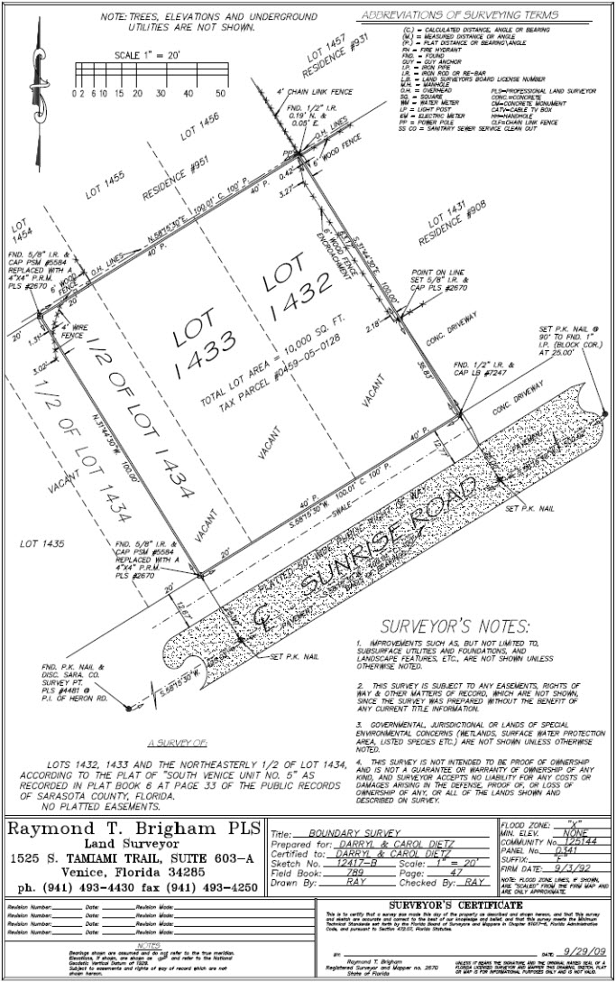 When buying or refinancing a home or commercial property a survey is usually required by your lender. This survey will show the boundary lines of the property and all existing improvements on the property. The survey will also show easements of record plotted on the survey. Utilities servicing the property and fences are some of the other important details that will be shown on the survey. |